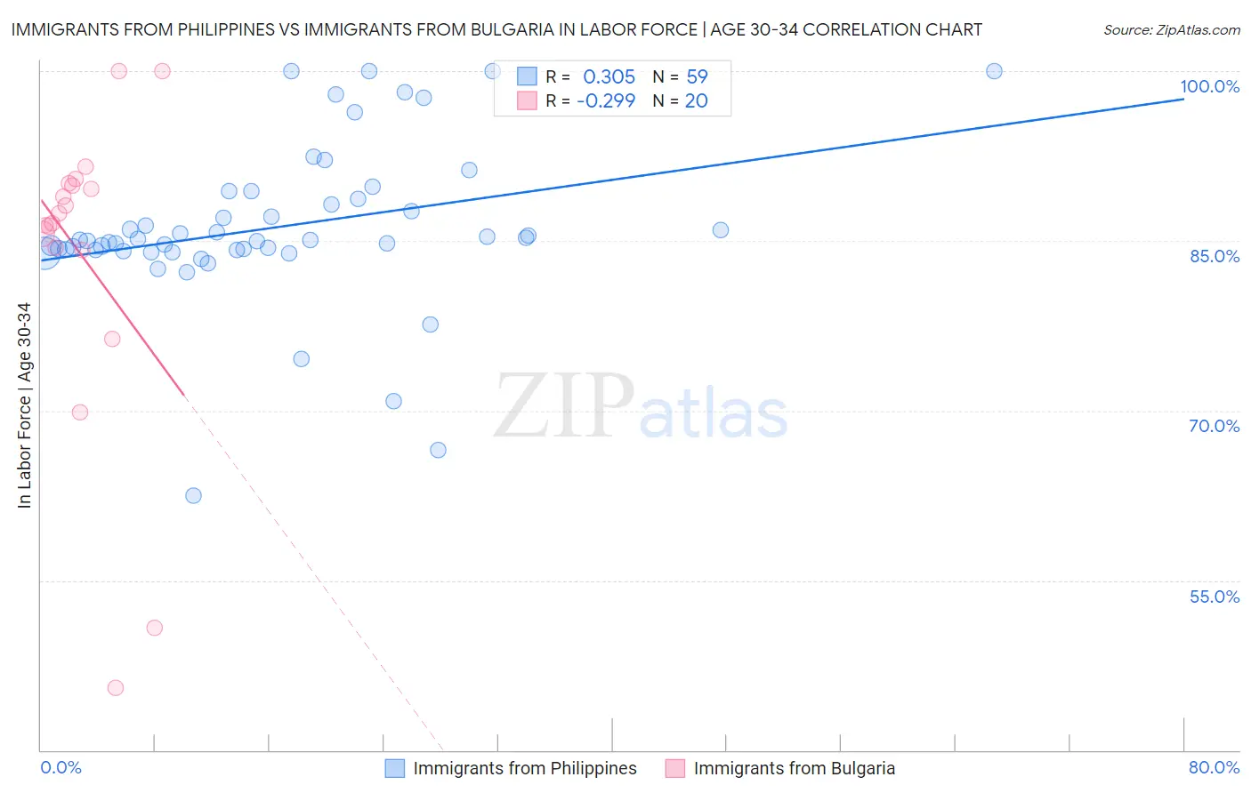 Immigrants from Philippines vs Immigrants from Bulgaria In Labor Force | Age 30-34 Correlation Chart