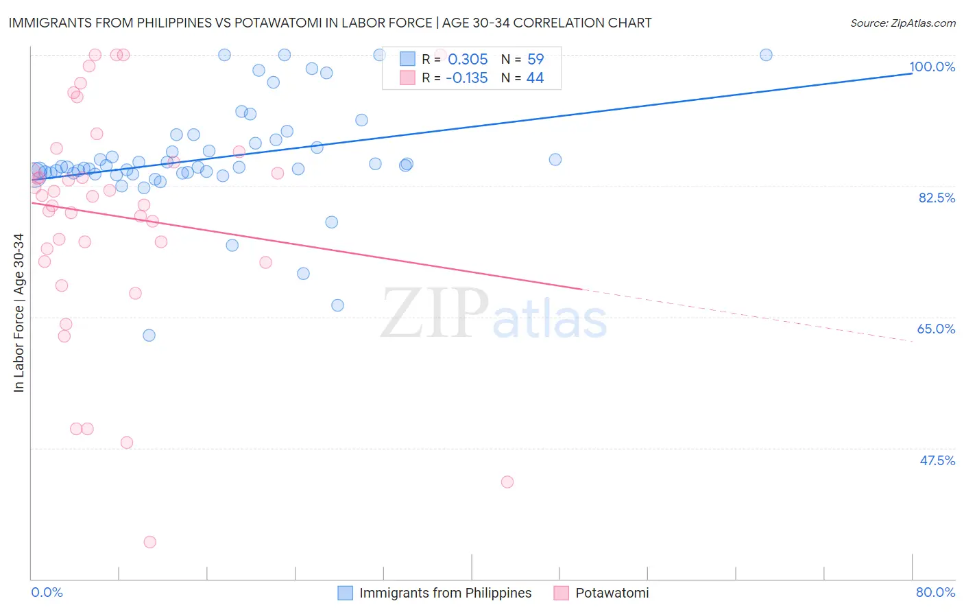 Immigrants from Philippines vs Potawatomi In Labor Force | Age 30-34 Correlation Chart