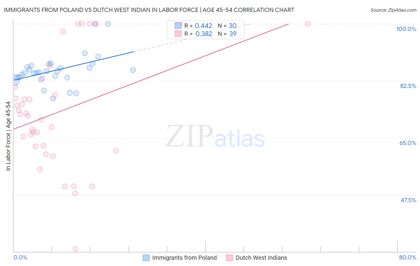 Immigrants from Poland vs Dutch West Indian In Labor Force | Age 45-54 Correlation Chart