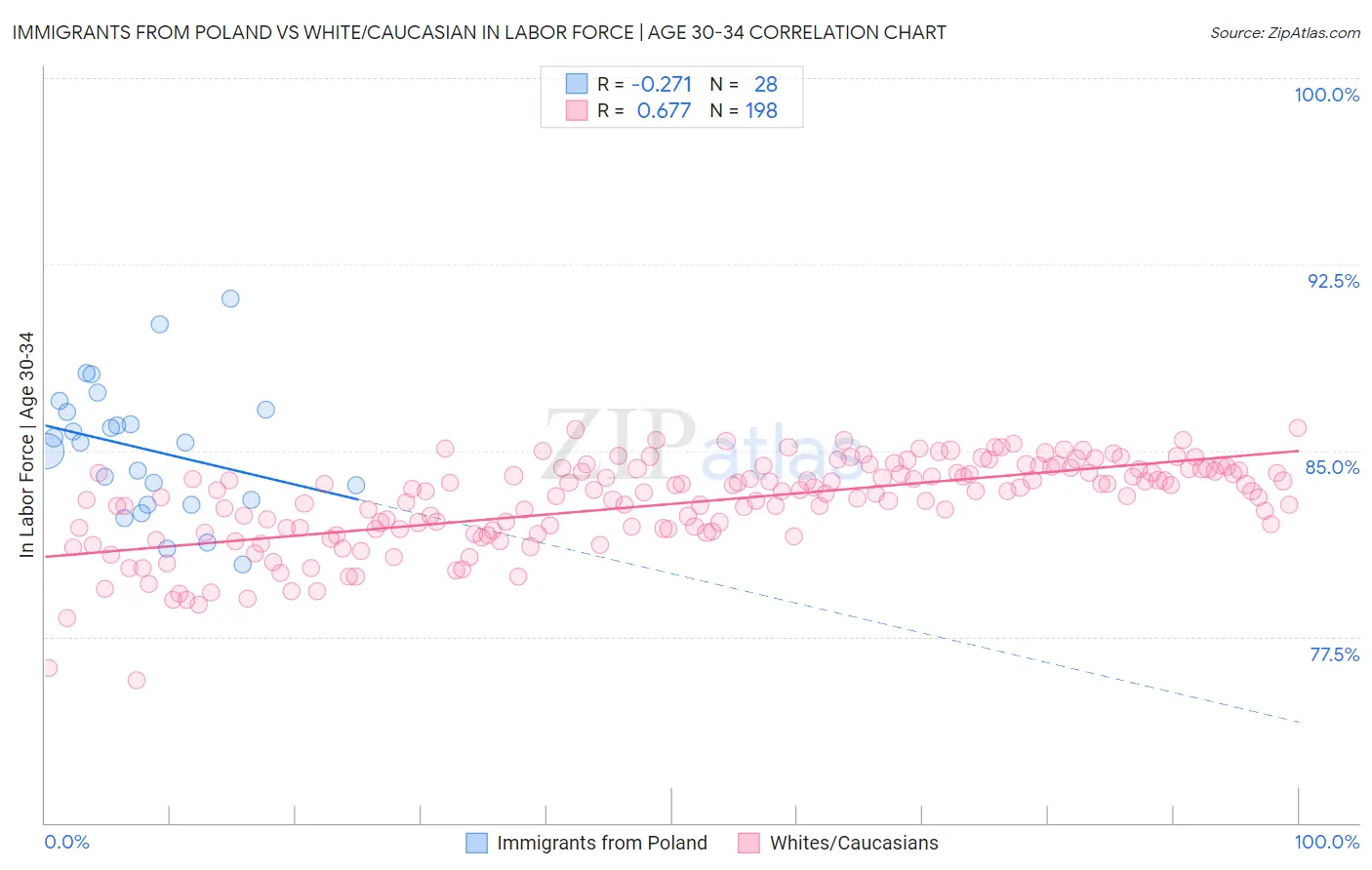 Immigrants from Poland vs White/Caucasian In Labor Force | Age 30-34 Correlation Chart