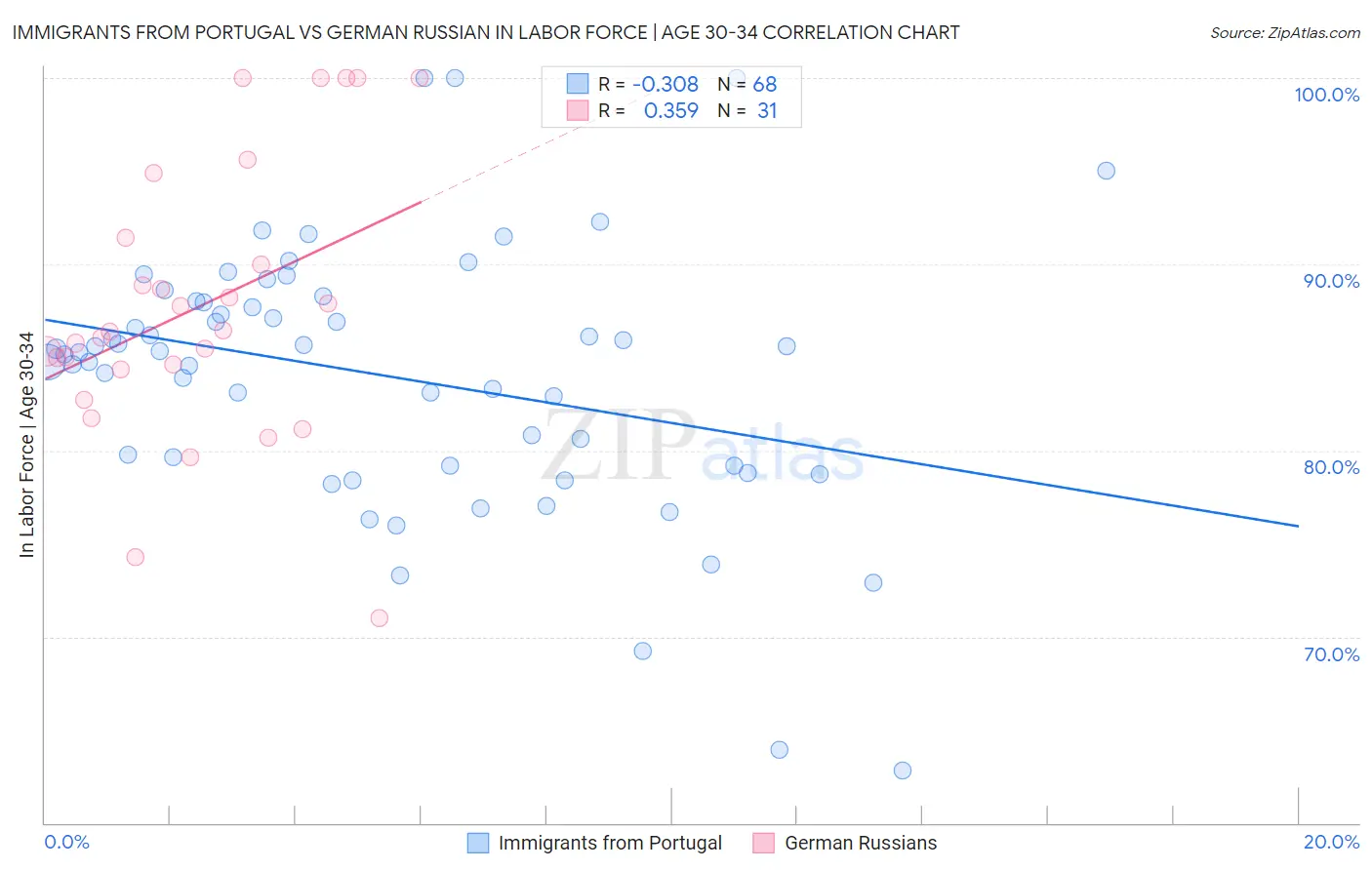 Immigrants from Portugal vs German Russian In Labor Force | Age 30-34 Correlation Chart