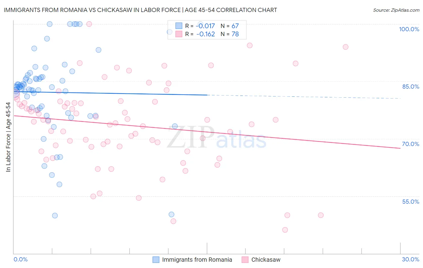 Immigrants from Romania vs Chickasaw In Labor Force | Age 45-54 Correlation Chart
