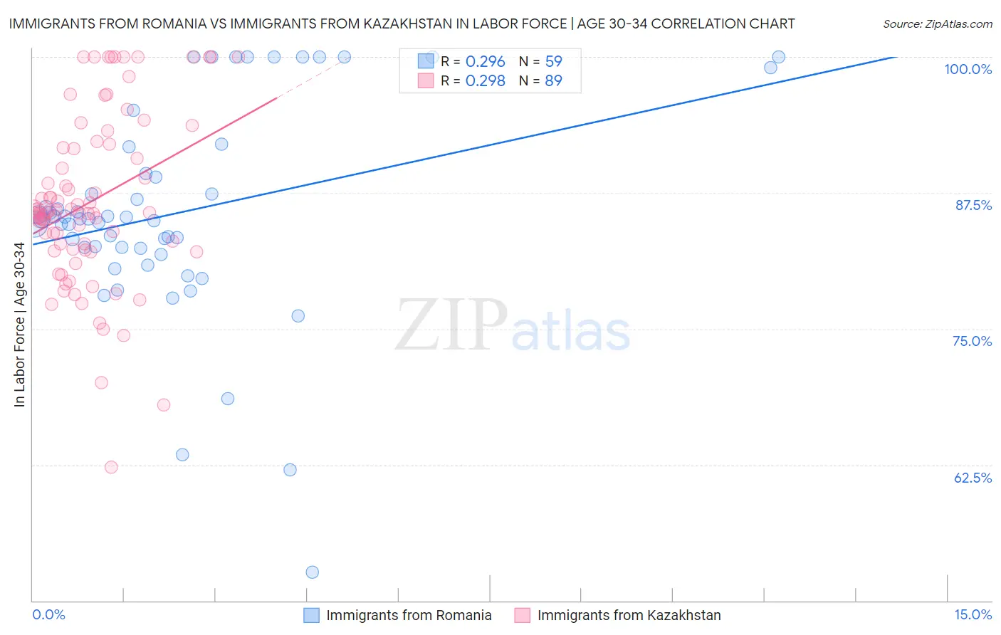 Immigrants from Romania vs Immigrants from Kazakhstan In Labor Force | Age 30-34 Correlation Chart