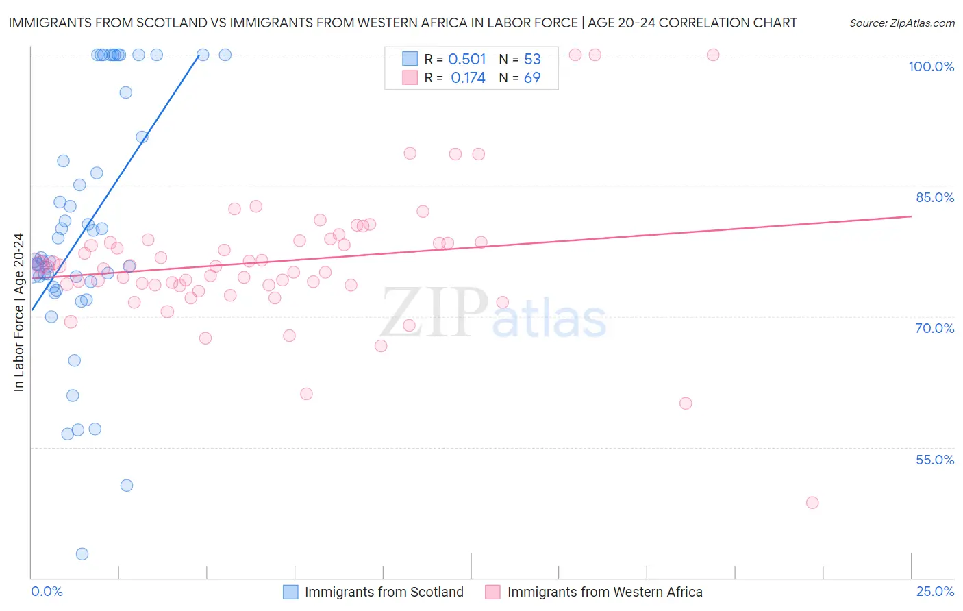 Immigrants from Scotland vs Immigrants from Western Africa In Labor Force | Age 20-24 Correlation Chart