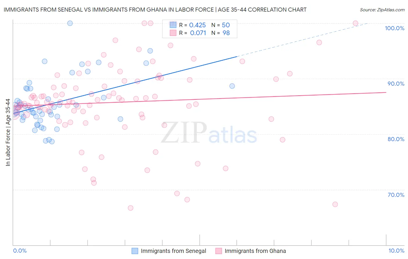 Immigrants from Senegal vs Immigrants from Ghana In Labor Force | Age 35-44 Correlation Chart