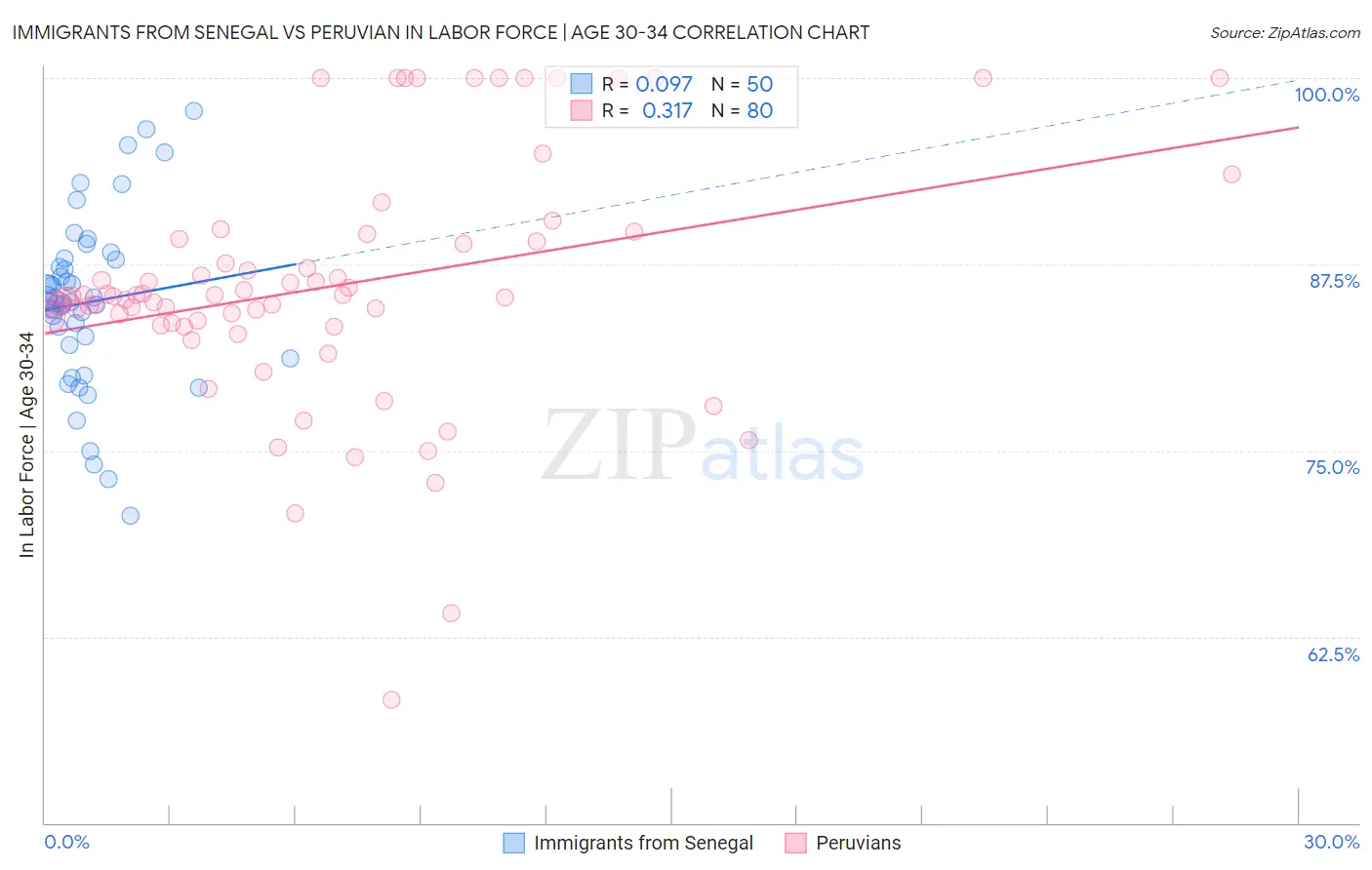Immigrants from Senegal vs Peruvian In Labor Force | Age 30-34 Correlation Chart