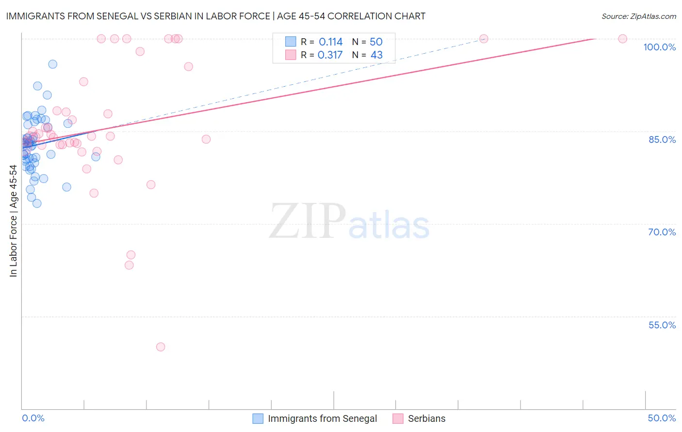 Immigrants from Senegal vs Serbian In Labor Force | Age 45-54 Correlation Chart