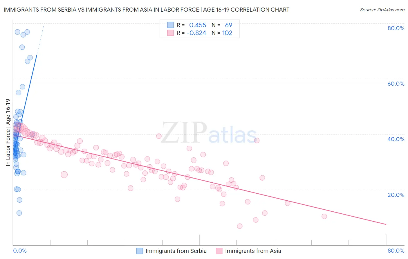 Immigrants from Serbia vs Immigrants from Asia In Labor Force | Age 16-19 Correlation Chart