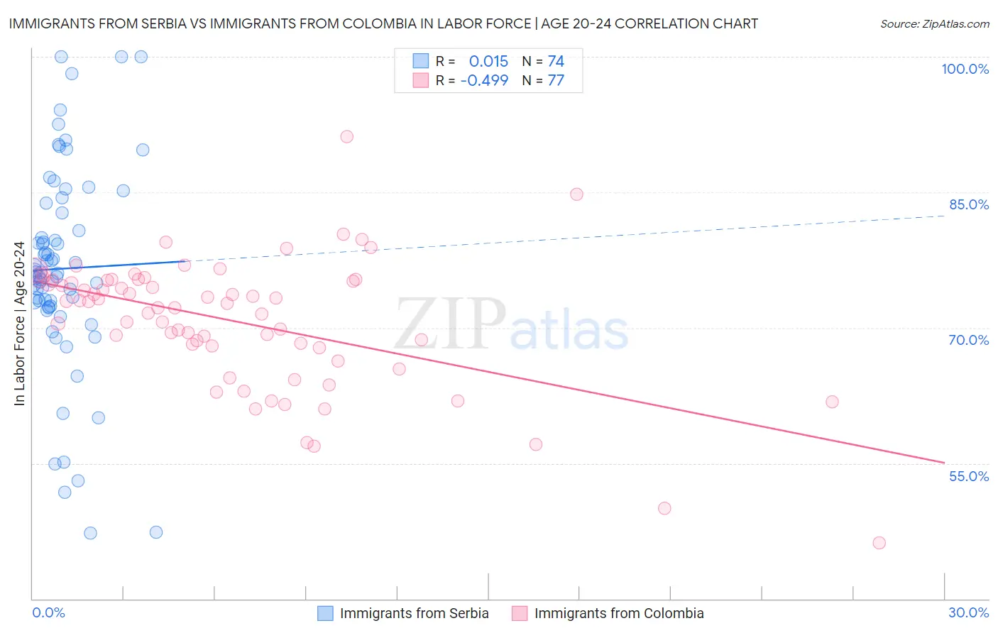 Immigrants from Serbia vs Immigrants from Colombia In Labor Force | Age 20-24 Correlation Chart
