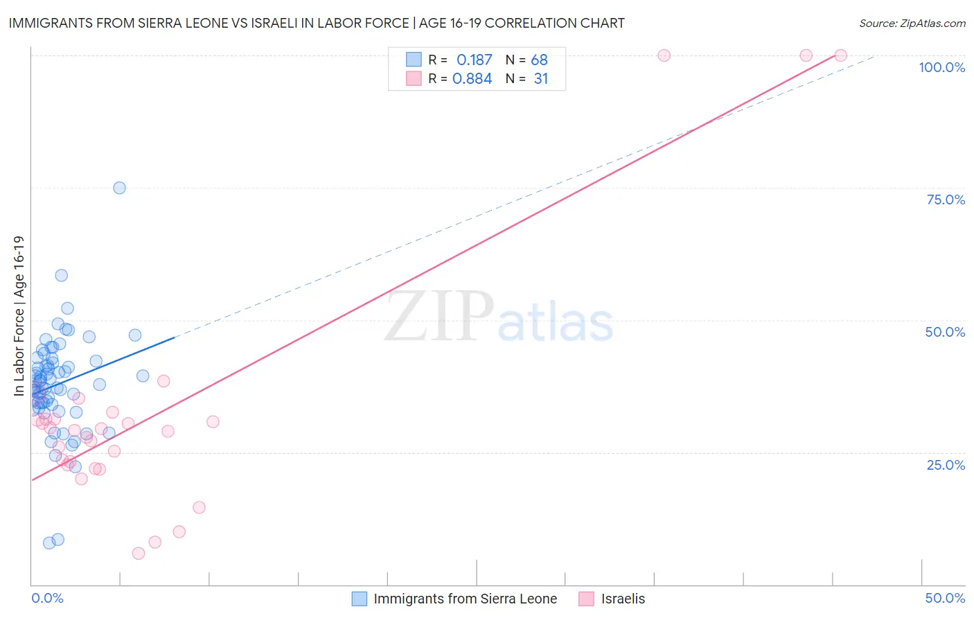 Immigrants from Sierra Leone vs Israeli In Labor Force | Age 16-19 Correlation Chart