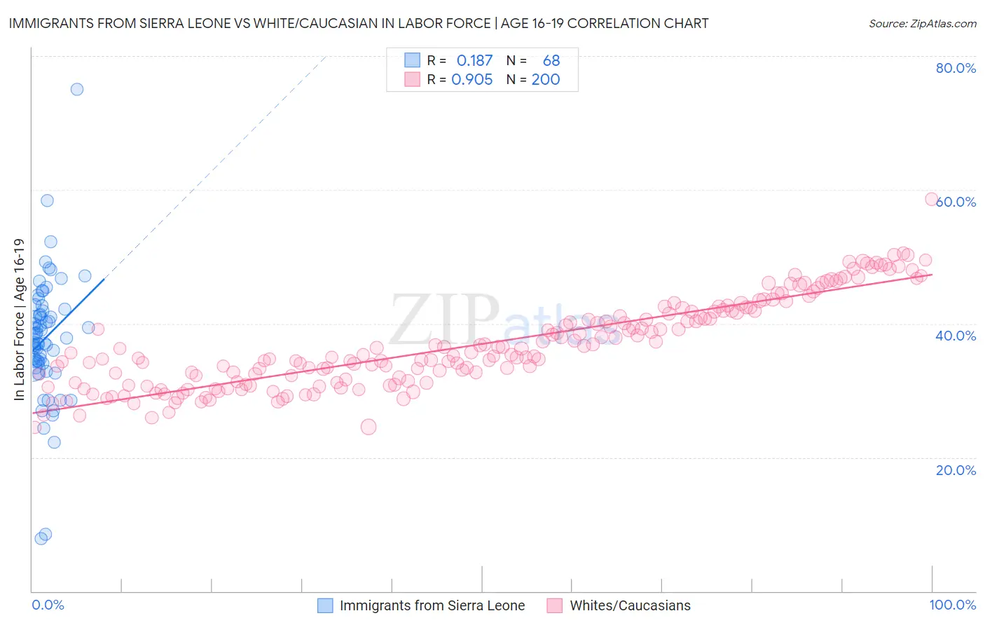 Immigrants from Sierra Leone vs White/Caucasian In Labor Force | Age 16-19 Correlation Chart