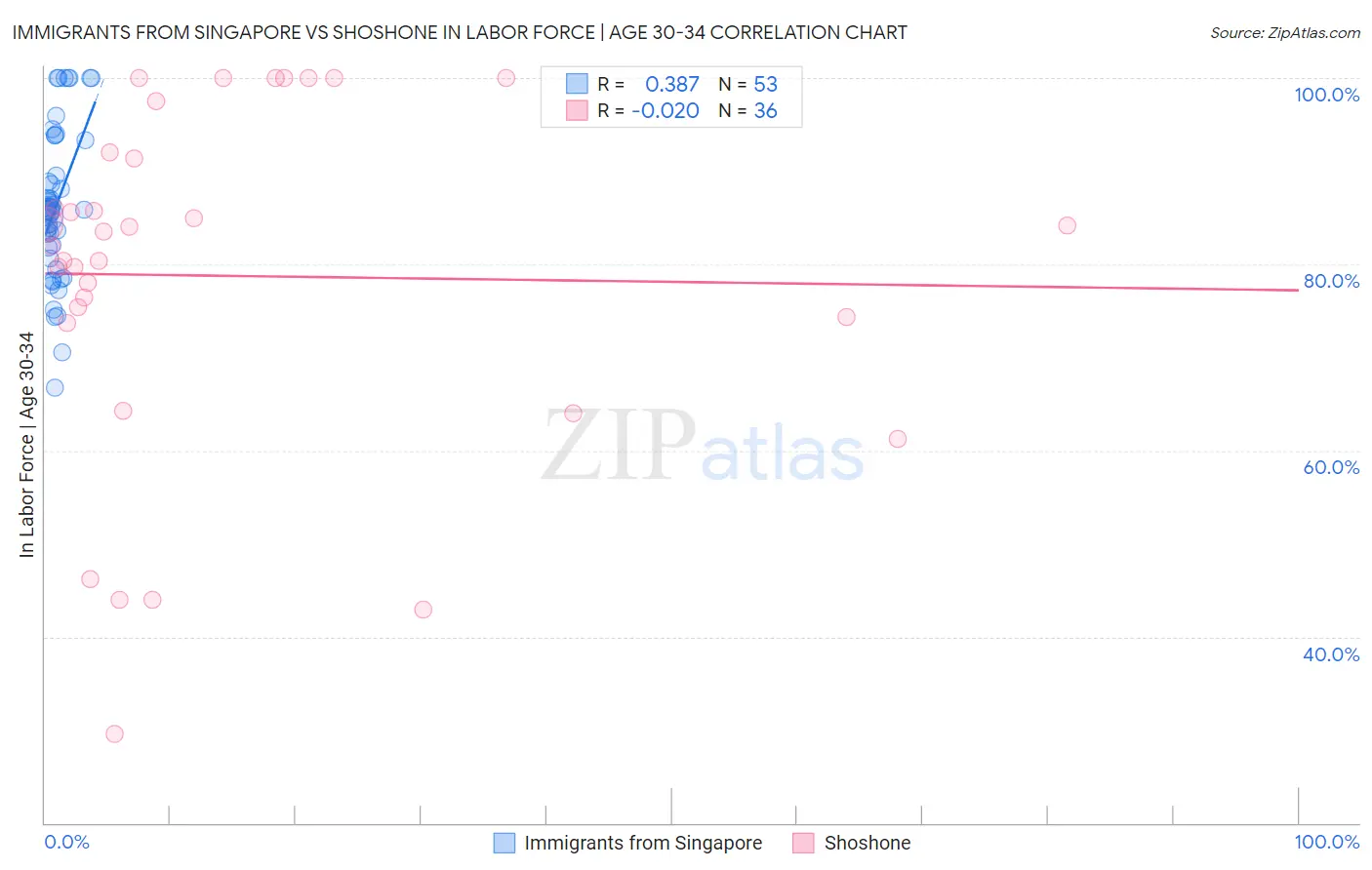 Immigrants from Singapore vs Shoshone In Labor Force | Age 30-34 Correlation Chart