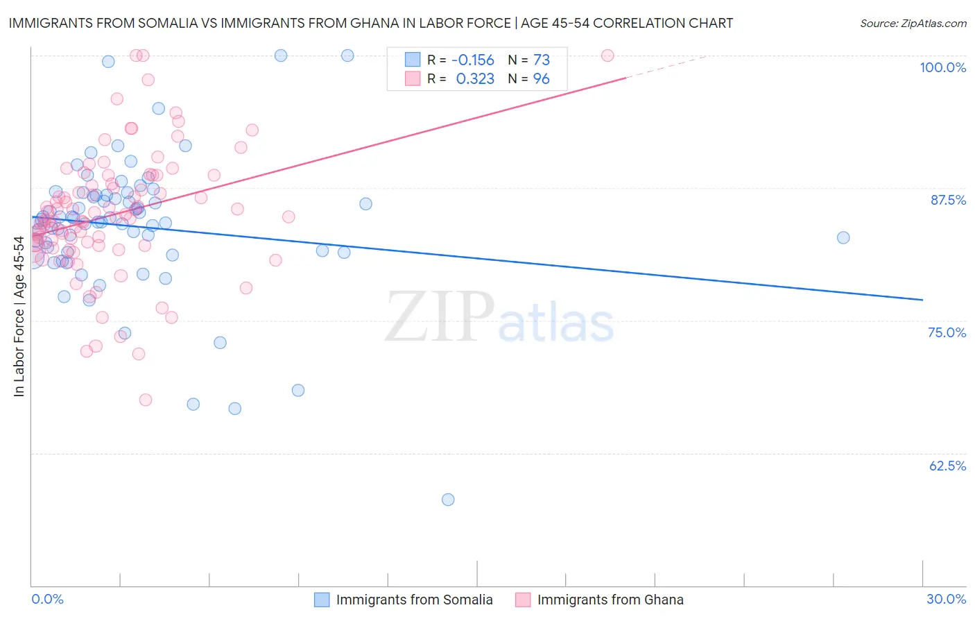 Immigrants from Somalia vs Immigrants from Ghana In Labor Force | Age 45-54 Correlation Chart