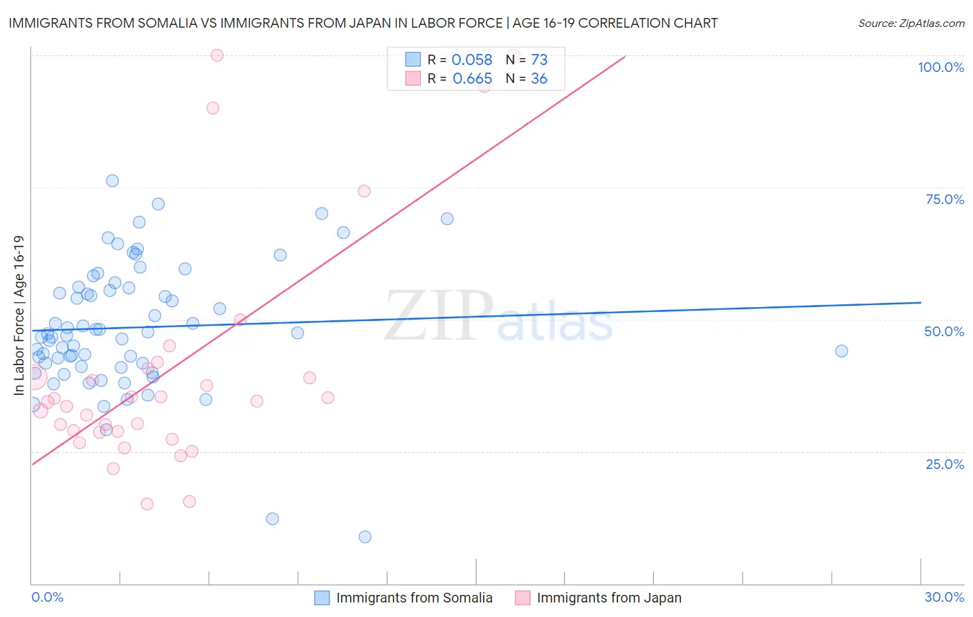 Immigrants from Somalia vs Immigrants from Japan In Labor Force | Age 16-19 Correlation Chart