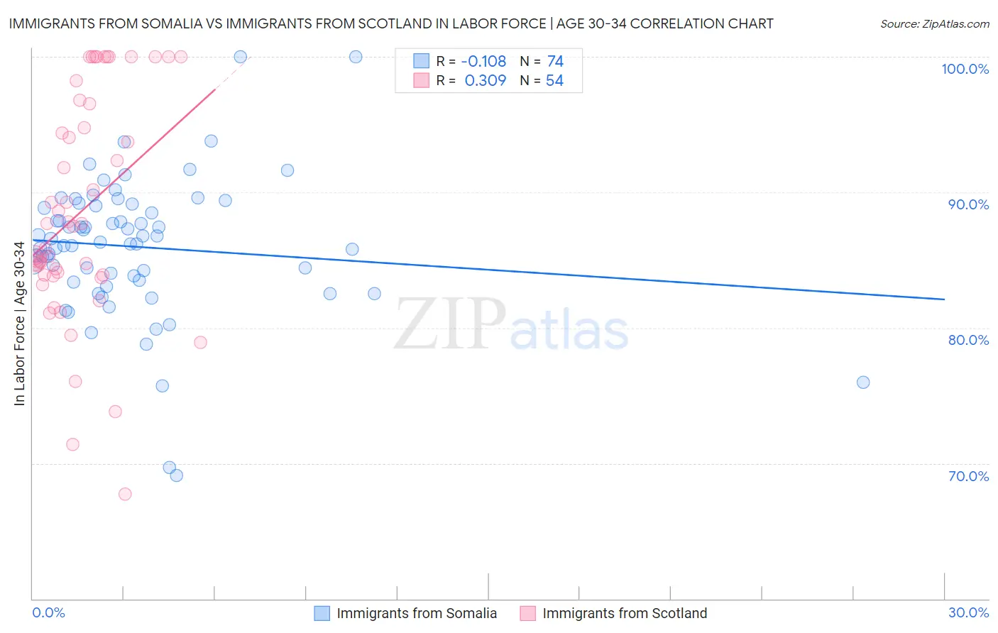 Immigrants from Somalia vs Immigrants from Scotland In Labor Force | Age 30-34 Correlation Chart