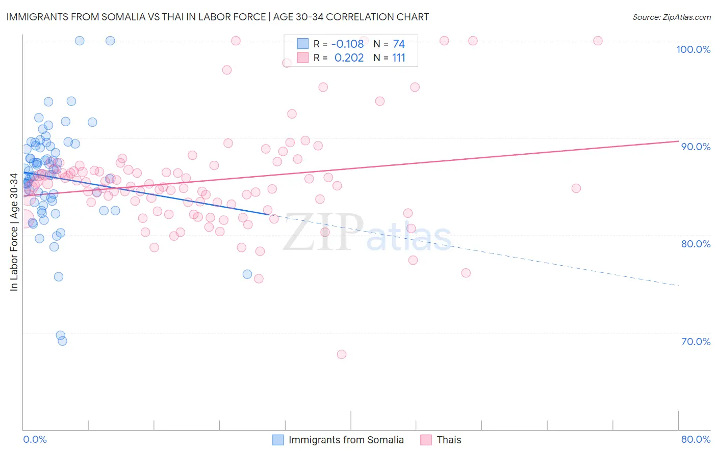 Immigrants from Somalia vs Thai In Labor Force | Age 30-34 Correlation Chart