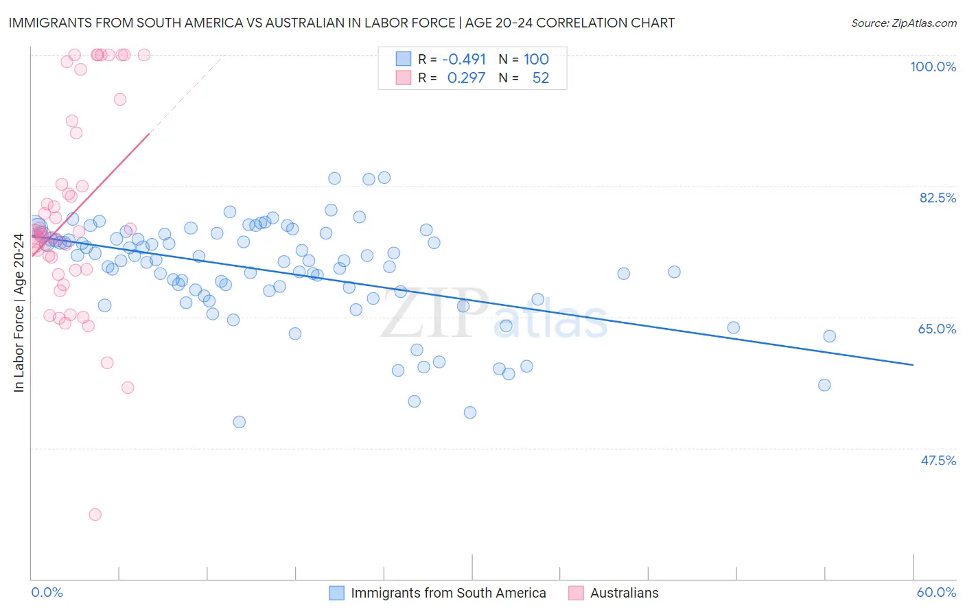 Immigrants from South America vs Australian In Labor Force | Age 20-24 Correlation Chart