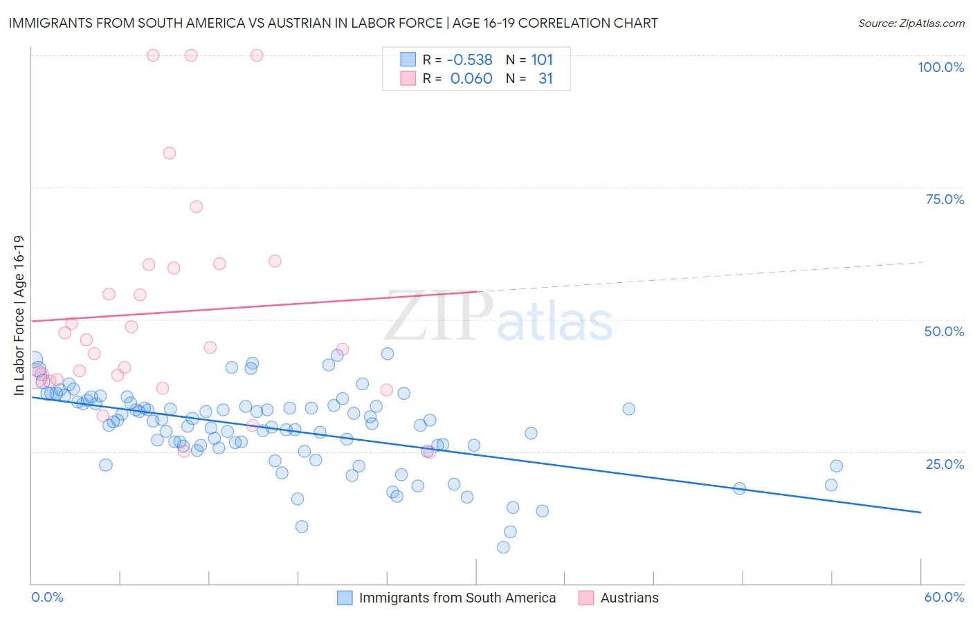 Immigrants from South America vs Austrian In Labor Force | Age 16-19 Correlation Chart