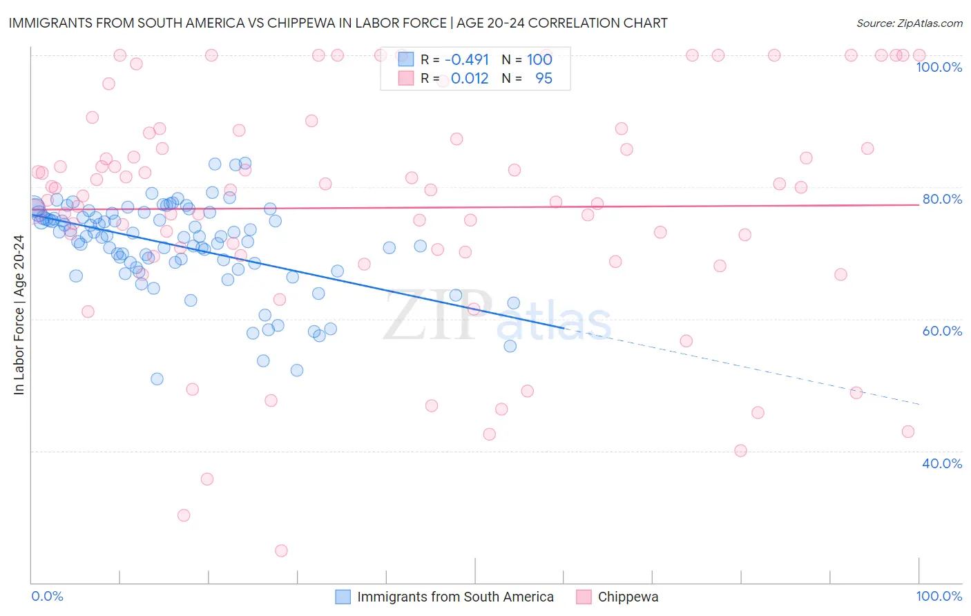 Immigrants from South America vs Chippewa In Labor Force | Age 20-24 Correlation Chart