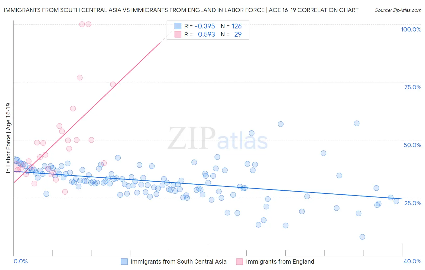 Immigrants from South Central Asia vs Immigrants from England In Labor Force | Age 16-19 Correlation Chart