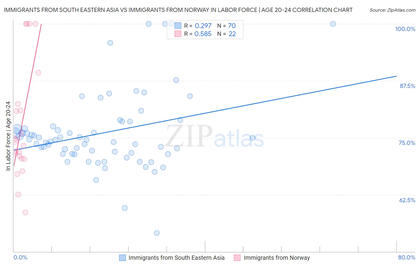 Immigrants from South Eastern Asia vs Immigrants from Norway In Labor Force | Age 20-24 Correlation Chart