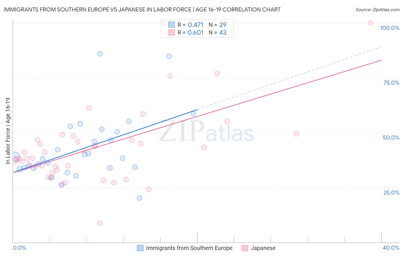 Immigrants from Southern Europe vs Japanese In Labor Force | Age 16-19 Correlation Chart