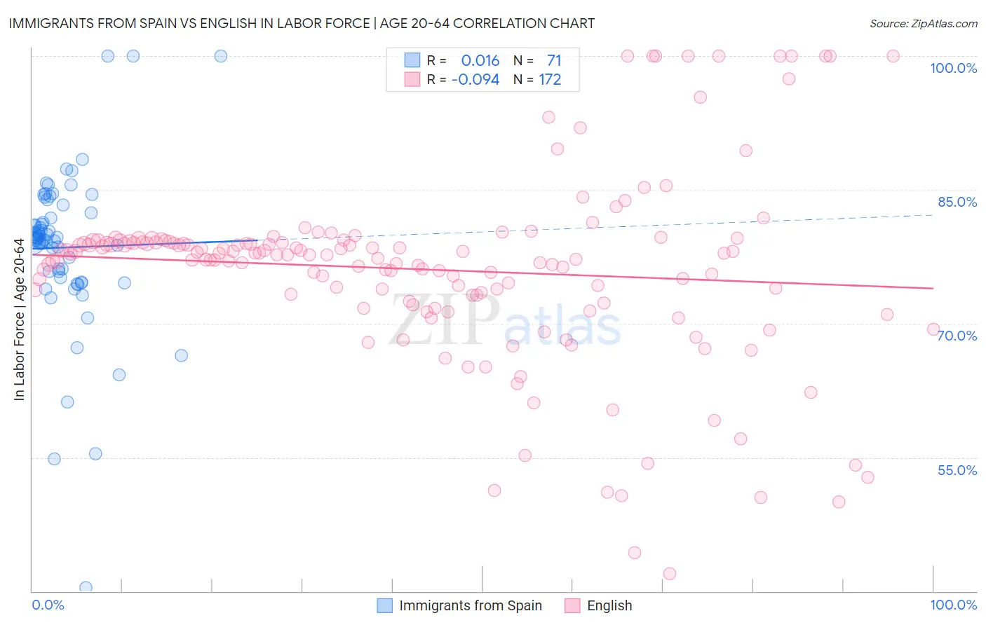 The statistical analysis conducted on geographies consisting of 239,685,771 people shows no correlation between the proportion of Immigrants from Spain and labor force participation rate among population between the ages 20 and 64 in the United States with a correlation coefficient (R) of 0.016 and weighted average of 79.8%. Similarly, the statistical analysis conducted on geographies consisting of 579,959,630 people shows a slight negative correlation between the proportion of English and labor force participation rate among population between the ages 20 and 64 in the United States with a correlation coefficient (R) of -0.094 and weighted average of 78.8%, a difference of 1.3%.