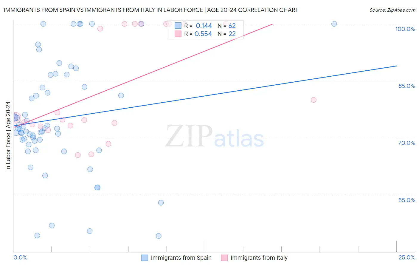 Immigrants from Spain vs Immigrants from Italy In Labor Force | Age 20-24 Correlation Chart