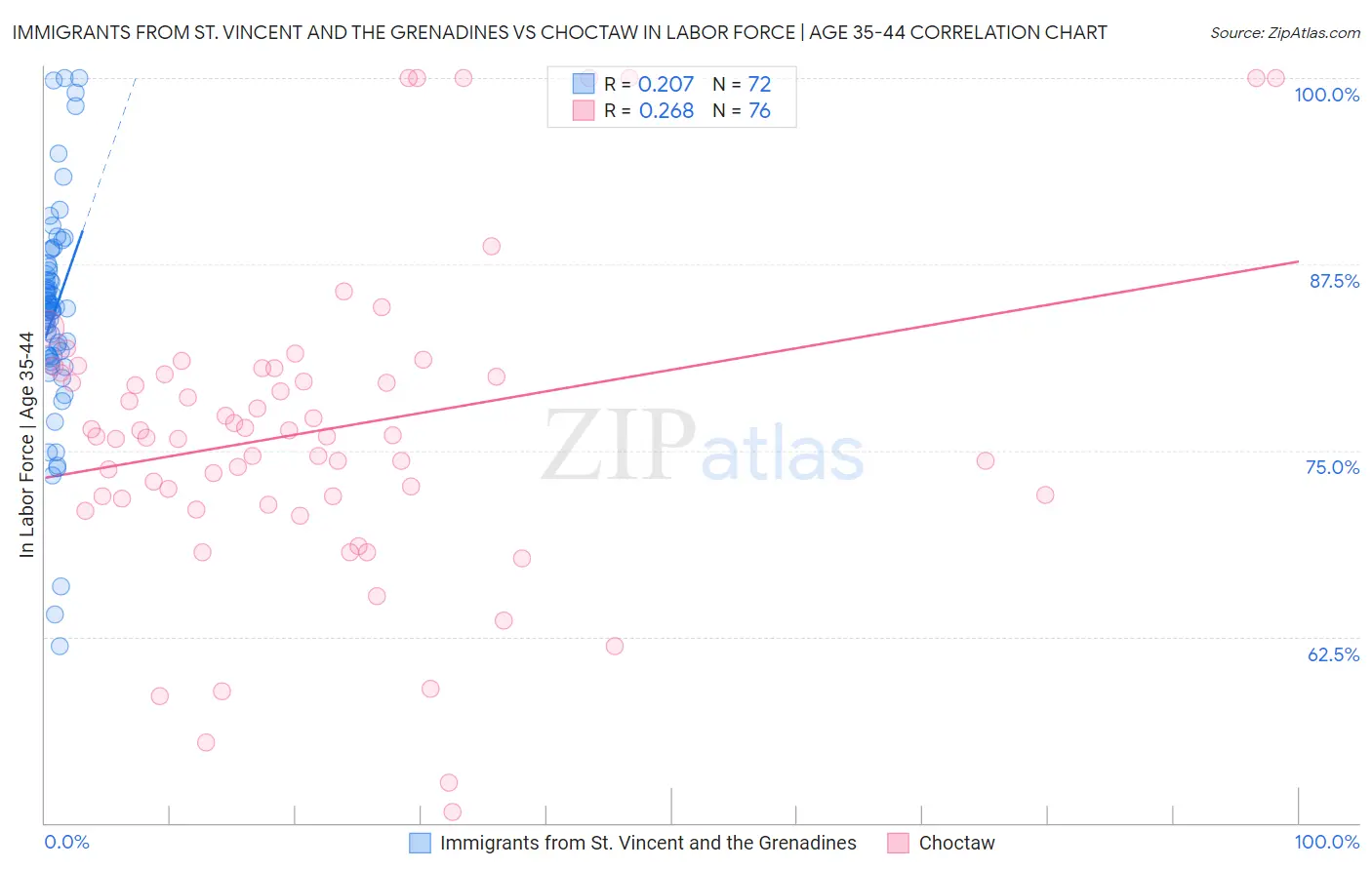 Immigrants from St. Vincent and the Grenadines vs Choctaw In Labor Force | Age 35-44 Correlation Chart