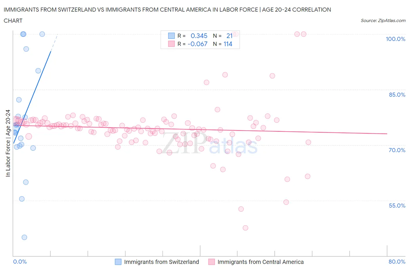 Immigrants from Switzerland vs Immigrants from Central America In Labor Force | Age 20-24 Correlation Chart
