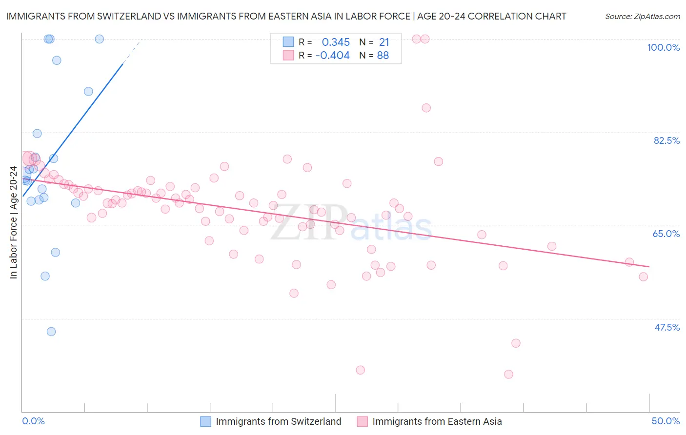 Immigrants from Switzerland vs Immigrants from Eastern Asia In Labor Force | Age 20-24 Correlation Chart