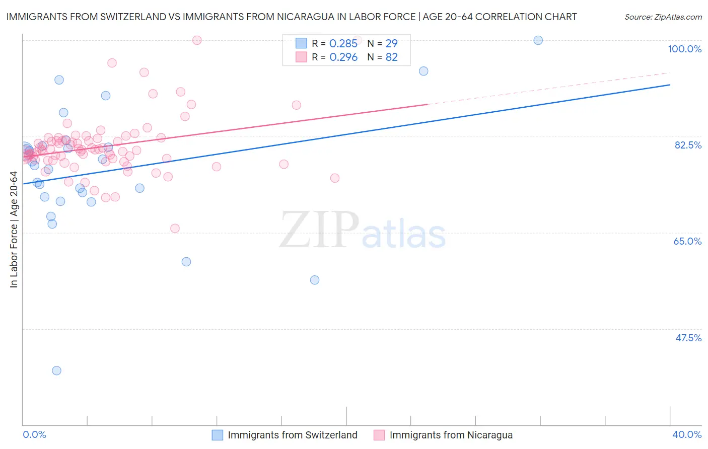 Immigrants from Switzerland vs Immigrants from Nicaragua In Labor Force | Age 20-64 Correlation Chart