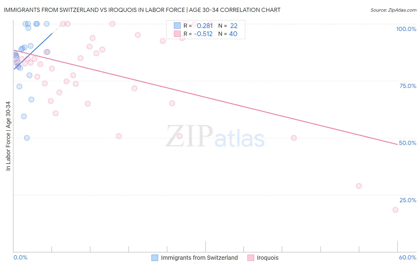 Immigrants from Switzerland vs Iroquois In Labor Force | Age 30-34 Correlation Chart