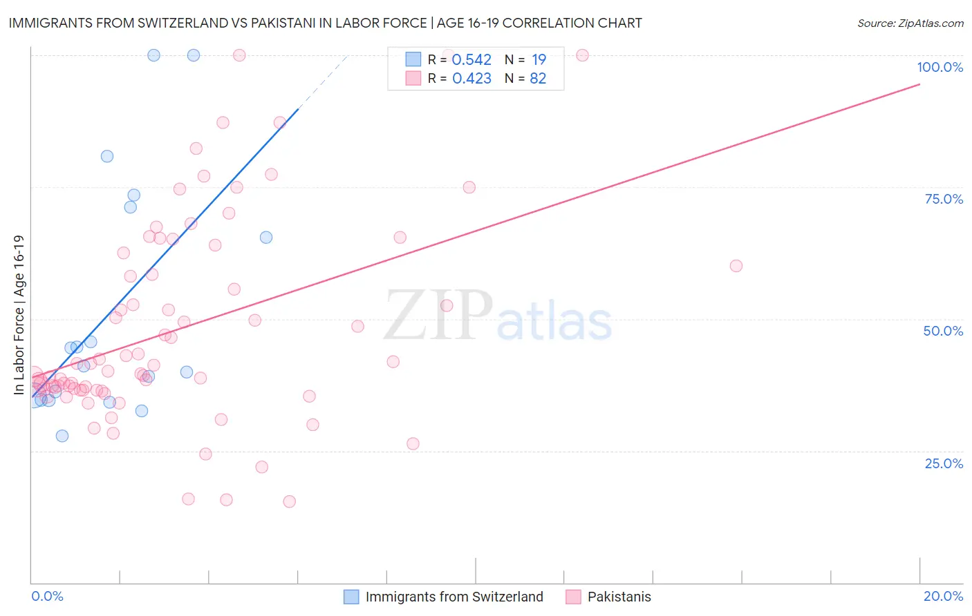 Immigrants from Switzerland vs Pakistani In Labor Force | Age 16-19 Correlation Chart