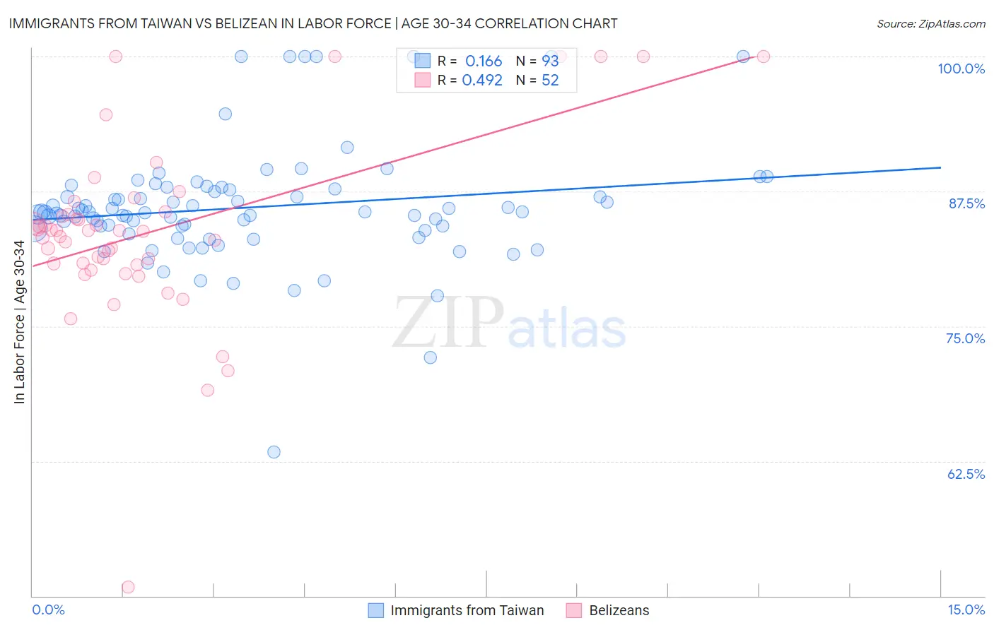 Immigrants from Taiwan vs Belizean In Labor Force | Age 30-34 Correlation Chart