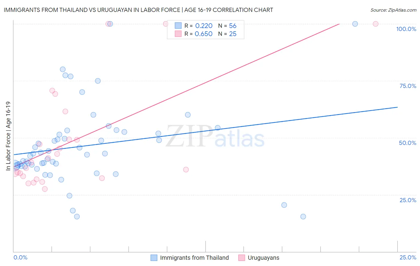 Immigrants from Thailand vs Uruguayan In Labor Force | Age 16-19 Correlation Chart