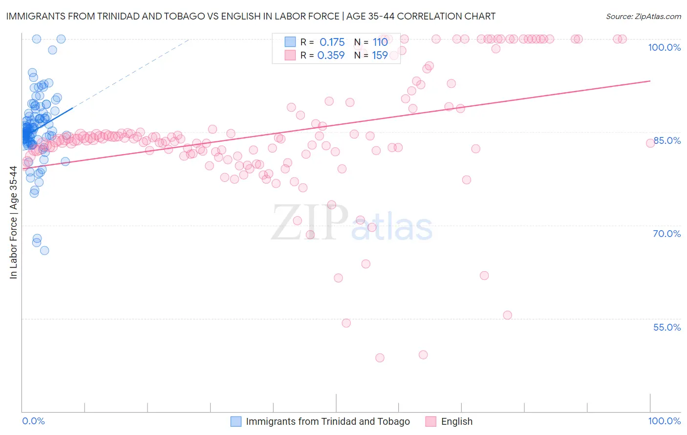 Immigrants from Trinidad and Tobago vs English In Labor Force | Age 35-44 Correlation Chart
