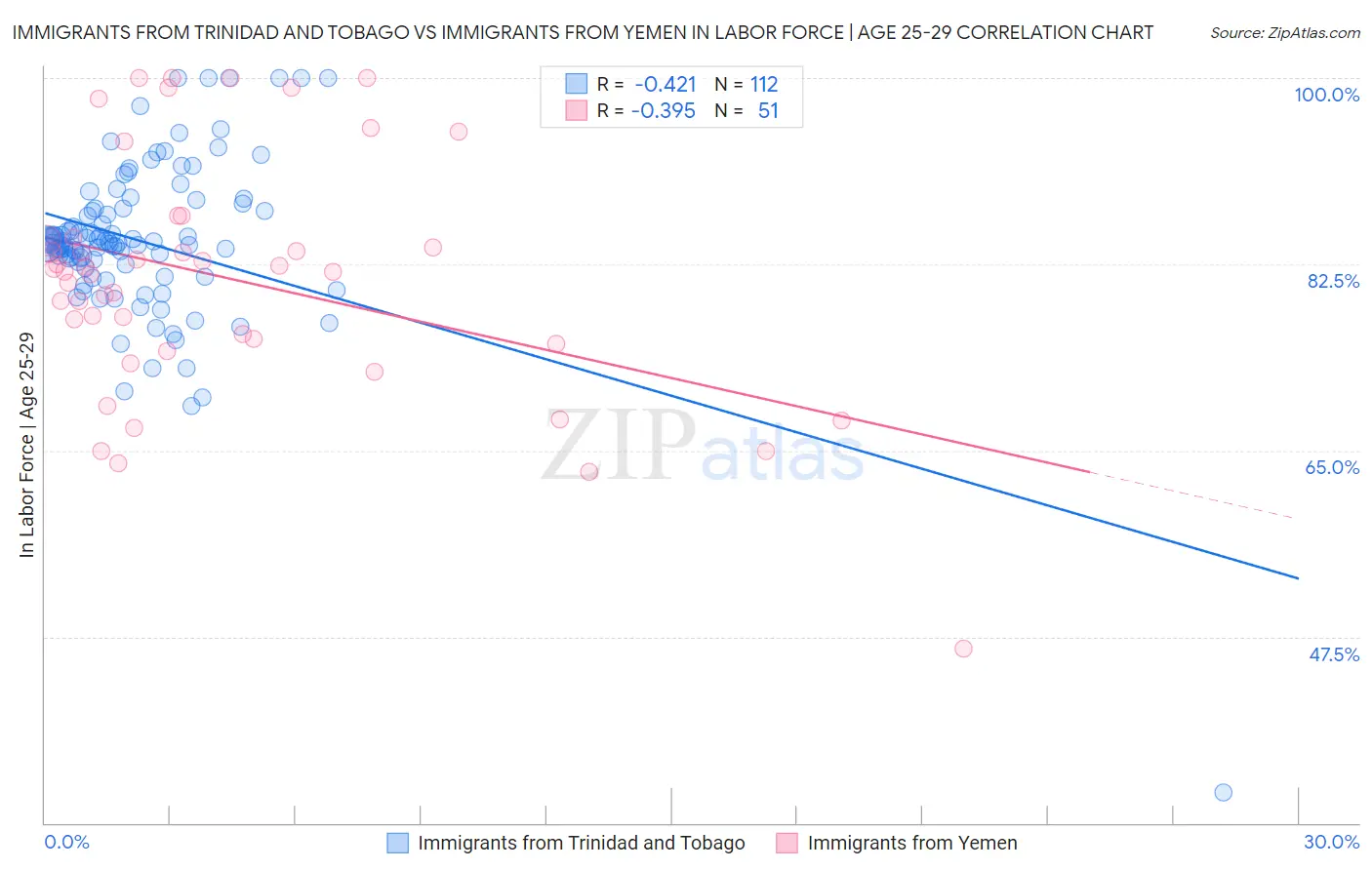 Immigrants from Trinidad and Tobago vs Immigrants from Yemen In Labor Force | Age 25-29 Correlation Chart