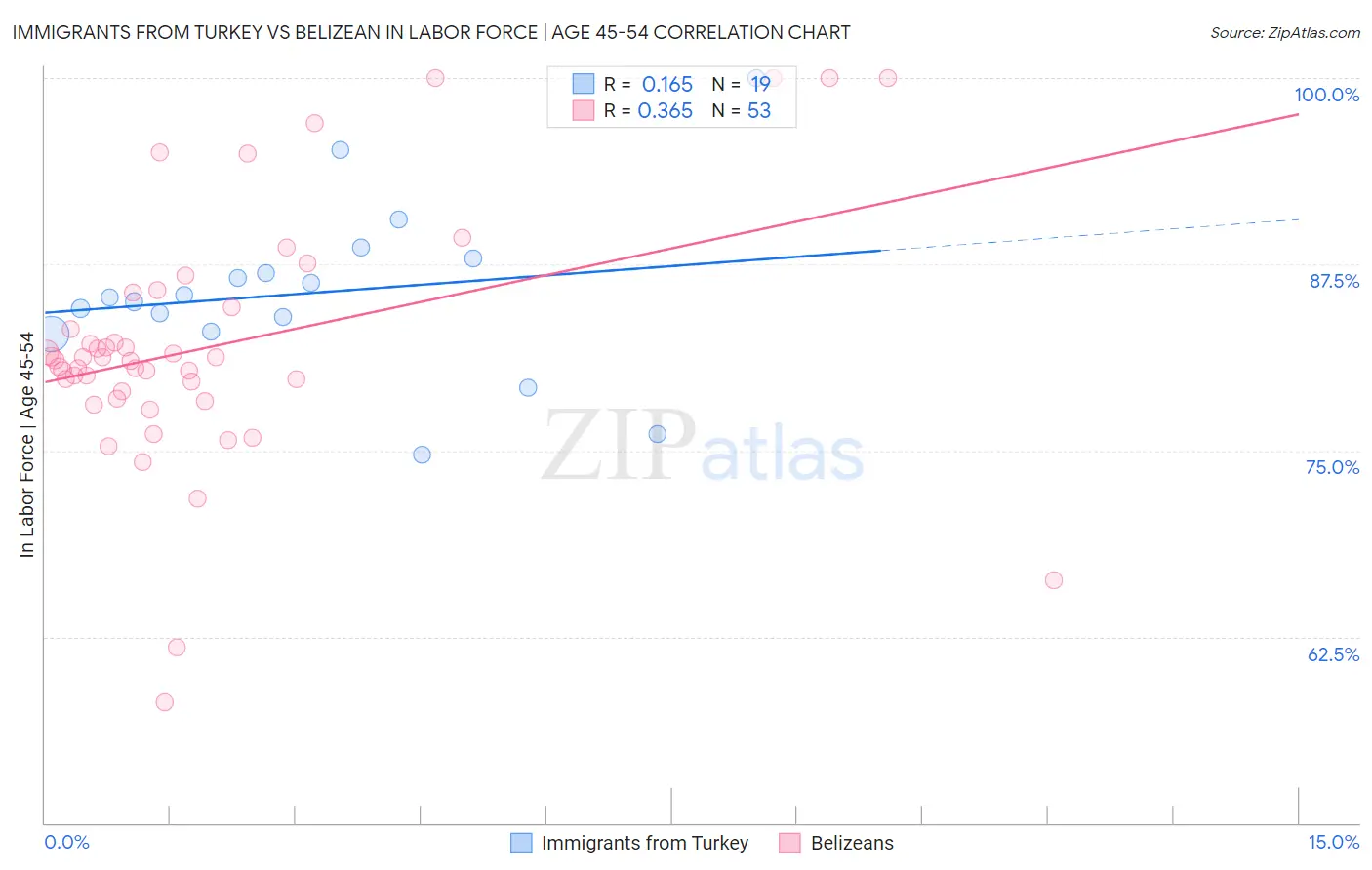 Immigrants from Turkey vs Belizean In Labor Force | Age 45-54 Correlation Chart
