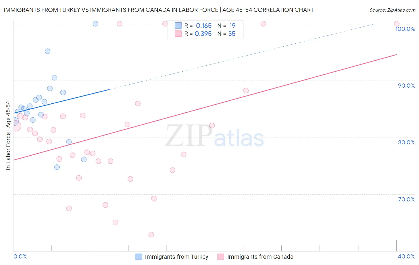 Immigrants from Turkey vs Immigrants from Canada In Labor Force | Age 45-54 Correlation Chart