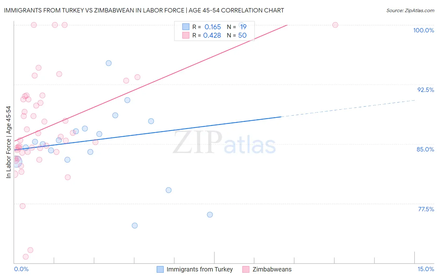 Immigrants from Turkey vs Zimbabwean In Labor Force | Age 45-54 Correlation Chart
