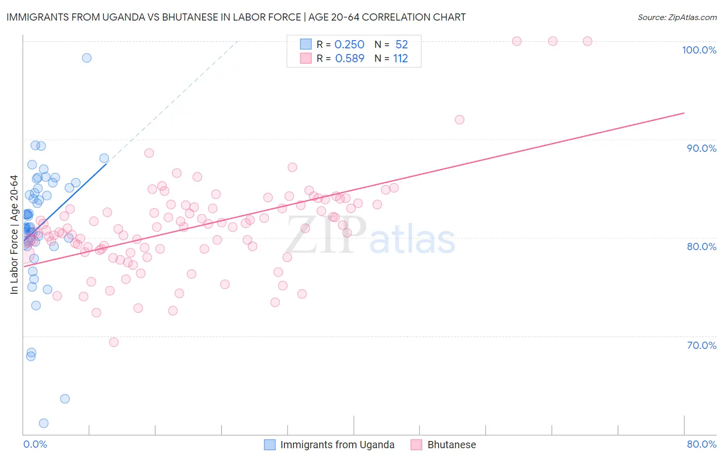 Immigrants from Uganda vs Bhutanese In Labor Force | Age 20-64 Correlation Chart