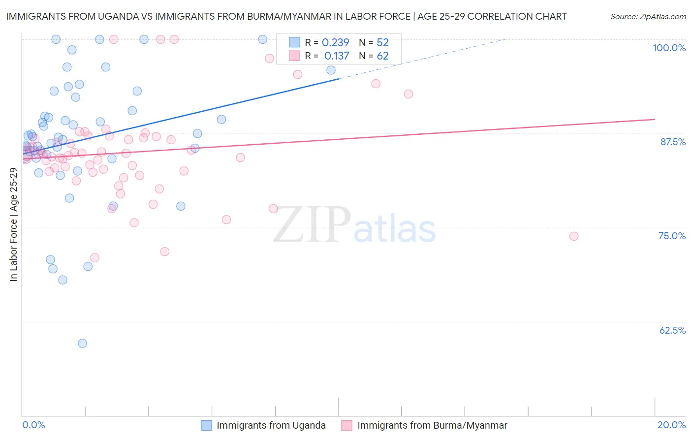 Immigrants from Uganda vs Immigrants from Burma/Myanmar In Labor Force | Age 25-29 Correlation Chart