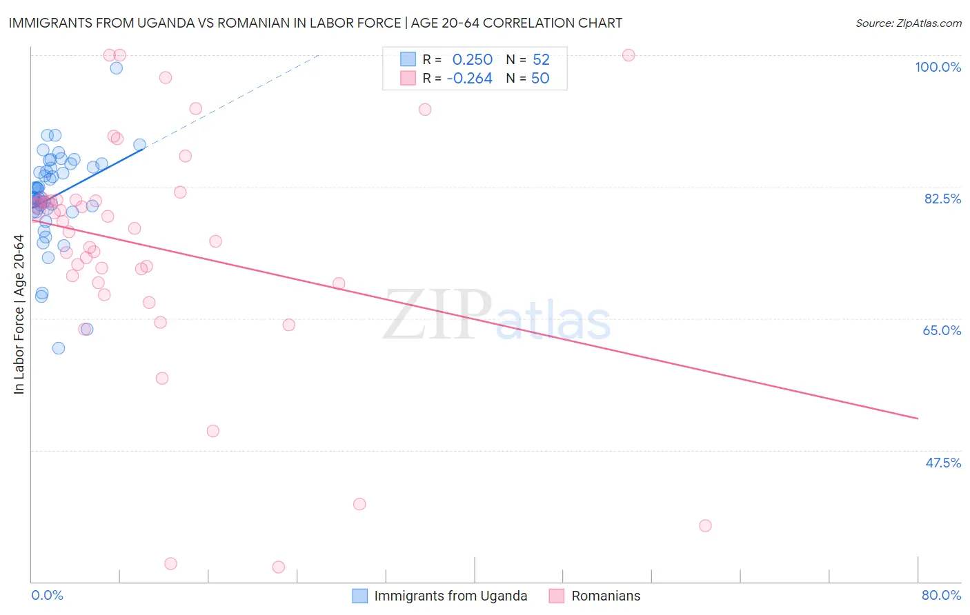 Immigrants from Uganda vs Romanian In Labor Force | Age 20-64 Correlation Chart