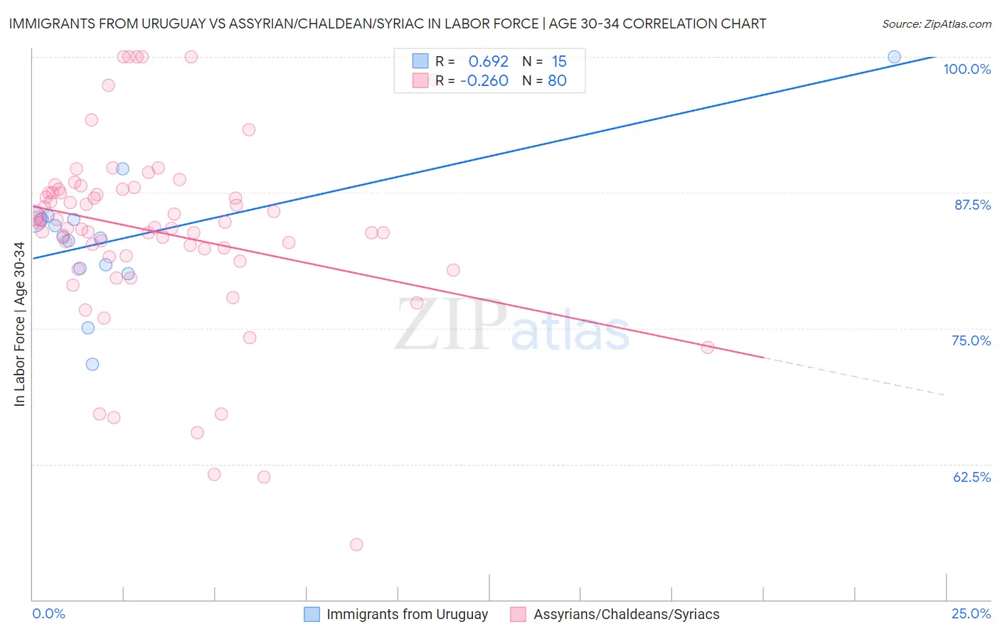 Immigrants from Uruguay vs Assyrian/Chaldean/Syriac In Labor Force | Age 30-34 Correlation Chart