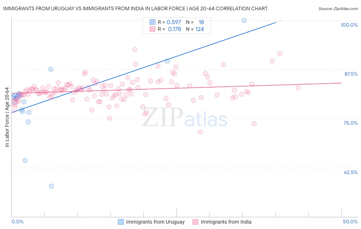 Immigrants from Uruguay vs Immigrants from India In Labor Force | Age 20-64 Correlation Chart
