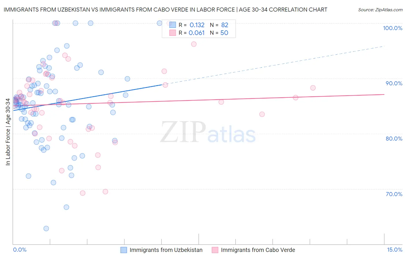 Immigrants from Uzbekistan vs Immigrants from Cabo Verde In Labor Force | Age 30-34 Correlation Chart