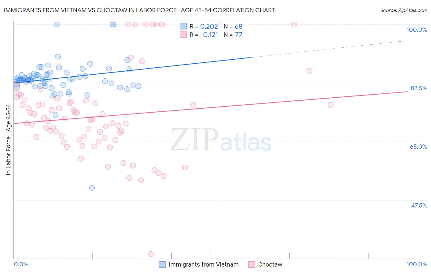 Immigrants from Vietnam vs Choctaw In Labor Force | Age 45-54 Correlation Chart