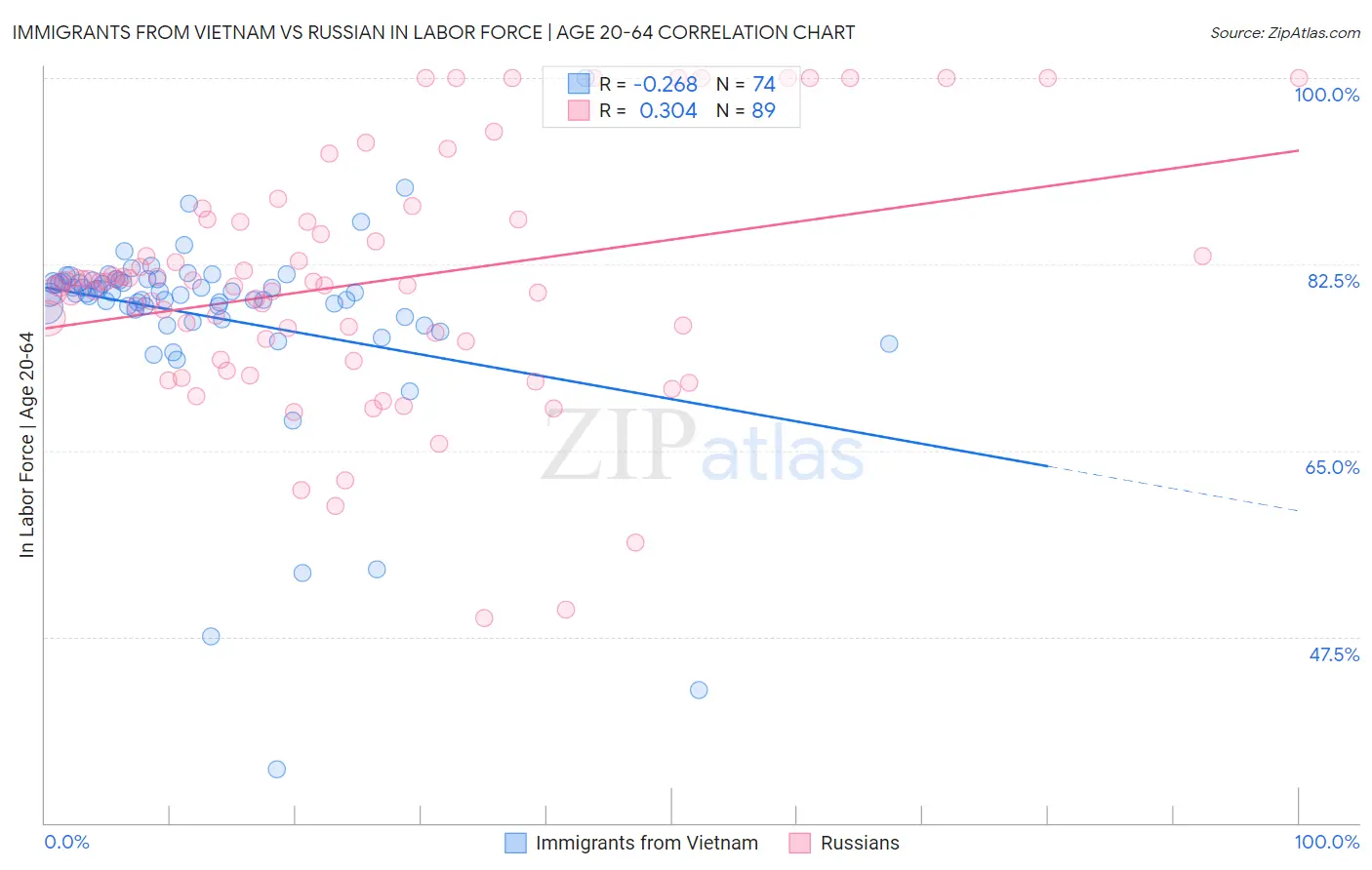 Immigrants from Vietnam vs Russian In Labor Force | Age 20-64 Correlation Chart