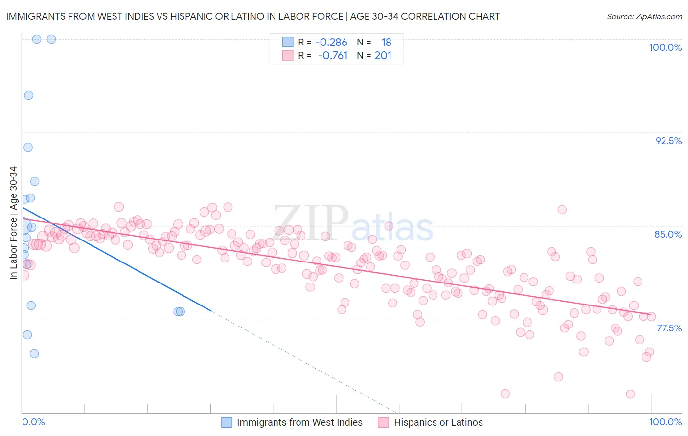 Immigrants from West Indies vs Hispanic or Latino In Labor Force | Age 30-34 Correlation Chart
